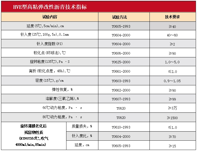HVE型高粘彈改性瀝青是在SBS改性瀝青基礎上,加入特制的高粘彈改性劑,經高溫熔融、剪切、發育形成的高性能改性瀝青。區別于普通SBS 改性瀝青, HVE 高粘彈改性瀝青粘度高、彈性恢復能力好,制備的改性瀝青混合料抗車轍性能、抗水損害性能以及抗飛散性能優異,能夠大幅度增加瀝青路面服役年限。
