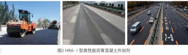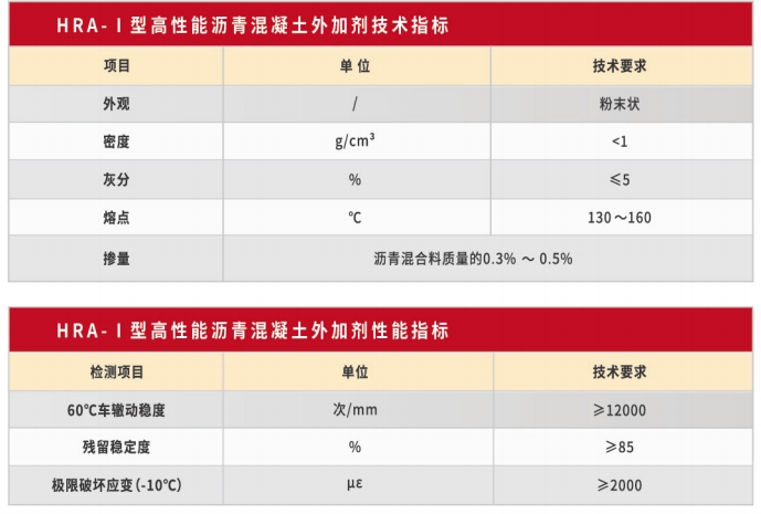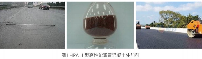 HRA-I 型高性能瀝青混凝土外加劑是一種粉末狀有機高分子材料,在瀝青混合料拌和過程中能夠快速融化分散,在集料骨架內(nèi)搭橋交聯(lián)形成網(wǎng)狀結(jié) 構(gòu),起到加筋作用,可加強瀝青膠漿的相互作用和整體性,提高瀝青的軟化點,在較高溫度時可提升路面的變形彈性恢復能力,降低成型瀝青路面的永久變形,大幅度提高瀝青混合料的高溫抗車轍性能。