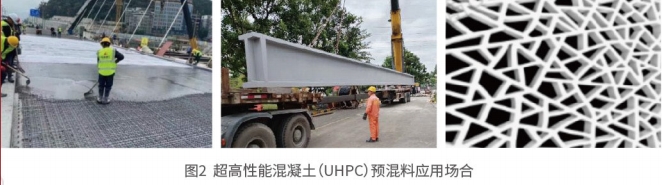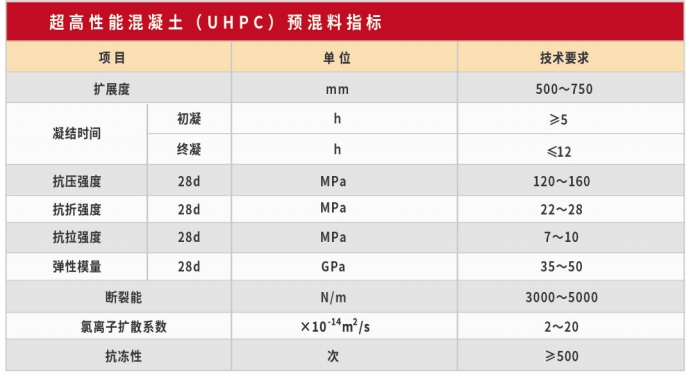 我司研發的超高性能混凝士(UHPC)預混料是在上述設計原理的基礎上,基于混凝土高強技術、改性技術和自密實混凝土技術,通過添加特殊膠凝材料、高效化學外加劑等技術制備而成,形成一種針對鋼橋面鋪裝、大型預制構件等特殊需求的超高強度、超高韌性混凝土產品。