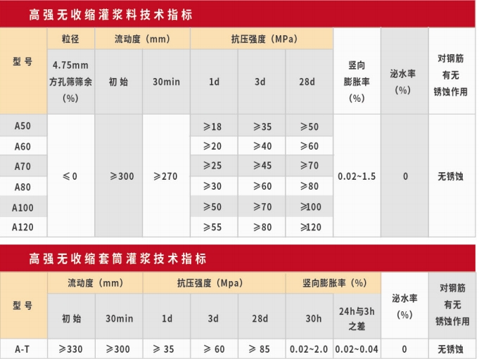 高強(qiáng)無收縮灌漿料是山膠凝材料、細(xì)集料、礦物摻合料以及功能性外加劑組成的特種砂漿,具有高強(qiáng)、高流態(tài)、無收縮、微膨脹等優(yōu)異性能。